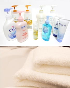浴室には女性の方に嬉しいアメニティを揃えております。 シャンプー、コンディショナー、ボディーソープ、洗顔フォーム、クレンジングオイルがございます。 2階洗面所と脱衣所にマイナスイオンドライヤーを常備しております。 お部屋にはフェイスタオル、バスタオル、歯ブラシセットをご用意しております。 お荷物を減らしてお越し下さいませ。 |